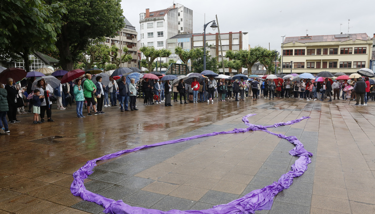 Miembros de la corporación portaban una gran pancarta con el lema: “Carballo contra as violencias machistas”. Los participantes también desplegaron en la Praza do Concello un enorme lazo morado para reivindicar la eliminación de la violencia machista.