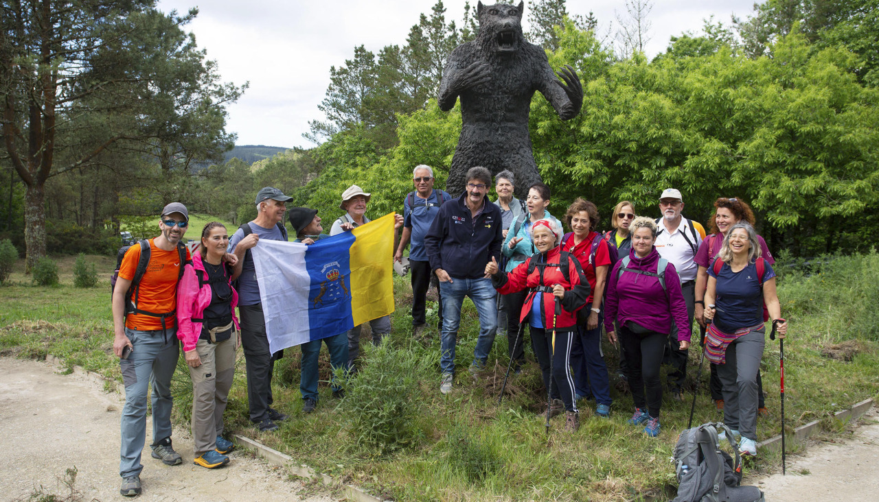 La estatua representa al hombre lobo que en el siglo XV se le apareció a un obispo armenio que decidió hacer el Camino desde Santiago de Compostela a Fisterra. Es la primera escultura dedicada a un hombre lobo en España.