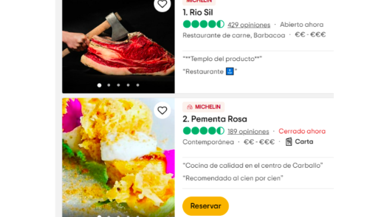 Así pues, el top 5 de restaurantes de Carballo es, por orden, Río Sil, Pementa Rosa, Vinoteca A de Paco, Pedra Furada y Pura Kixen. Todos se pueden consultar en el siguiente enlace.