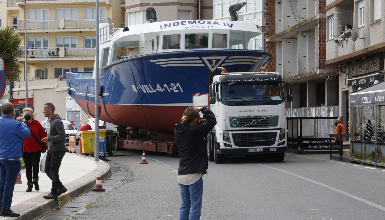 El dispositivo para trasladar las embarcaciones desde el astillero hasta el puerto de Laxe supuso un trabajo logístico que despertó gran expectación entre los vecinos y visitantes. Fue un trayecto lento y complicado, debido a las dimensiones del transporte. Hubo que despejar el recorrido para evitar la presencia de coches estacionados en la vía y salvar obstáculos como el tendido eléctrico o alguna señal. El transporte este jueves del “Indemosa IV” se llevó a cabo sin problemas, aunque tardó un poco más de tiempo que en los otros dos barcos.