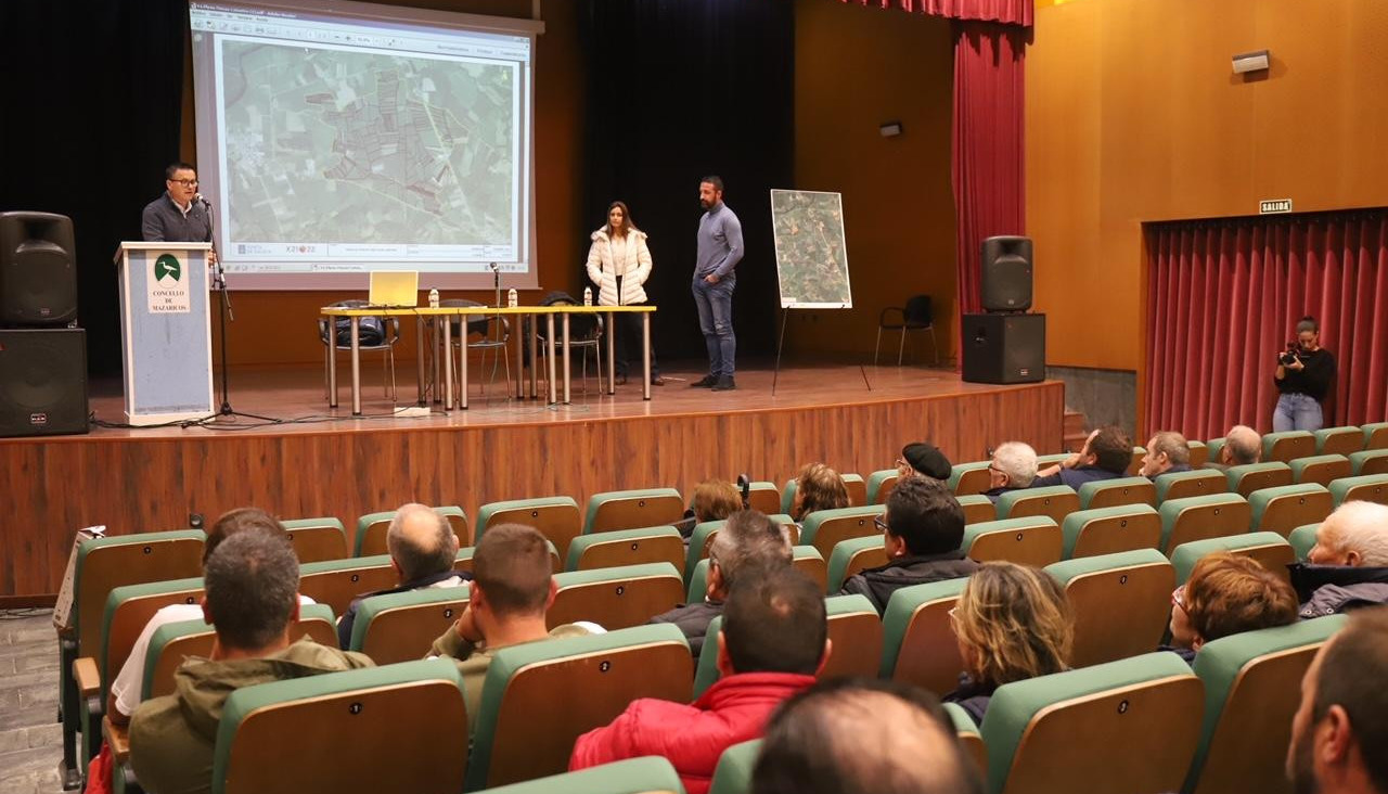 El conselleiro de Medio Rural, José González, acompañado por la directora xeral de la Axencia Galega de Desenvolvemento Rural, Inés Santé; y el alcalde de Mazaricos, Juan José Blanco, mantuvo una reunión con los vecinos de este concello este sábado para anunciar la posibilidad de impulsar una polígono agroforestal en esta zona.