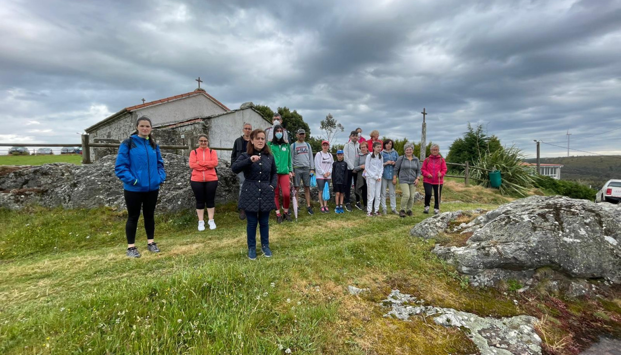La propia alcaldesa de Santa Comba, María Pose, acudió al punto de partida para repartir entre el casi medio centenar de participantes las mochilas en las que figuraba impresa la figura del poeta de Varilongo y un pequeño aprovisionamiento para afrontar los doce kilómetros de andadura que arrancaron de la ermita de San Bartolomeu, lugar al que el autor hizo varias referencias en sus escritos y donde el concejal de Educación, Manuel Iglesias, recitó algunos versos de Pepe de Xan Baña.